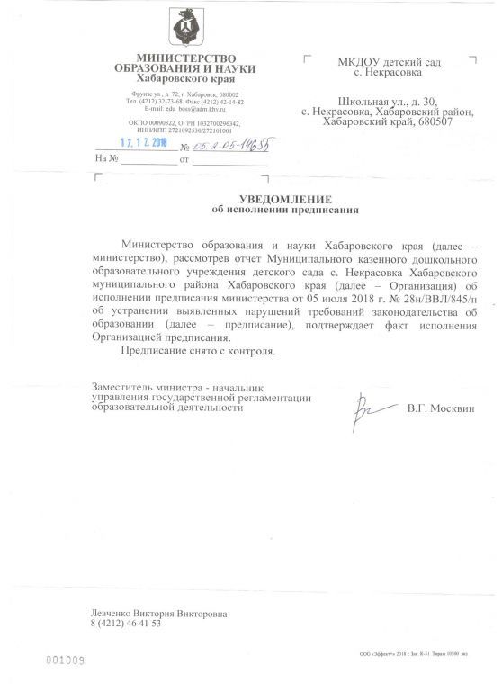Предписание №31-Н-ЕАС-14.05.14г Об устранении выявленных нарушений - Министерство образования и науки Хабаровского края.docx Документ подписан электронной подписью Серийный номер 603332450510203670830559428146817986133868575842 Заведующий Ломаева Елена Александровна Дата подписания документа 09.03.2021 10:25:49 (скачать)